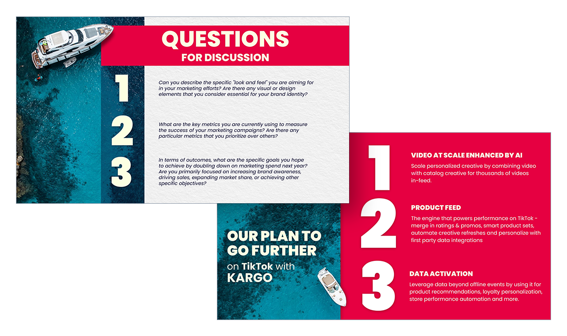 Cannes Lions Festival of Creativity, showcased the collaboration between Kargo and TikTok to revolutionize digital advertising for retailers. With evocative seaside imagery reflecting the Cannes setting, it highlights Kargo's use of AI-driven video at scale, product feed integration, and advanced data activation to enhance TikTok’s platform with personalized, dynamic ads. The design was intended to echo the combined cutting-edge ad technology and data-driven solutions of both companies, in order to appeal to worldwide brands in attendance.