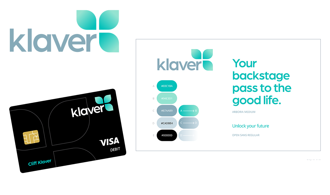 “backstage pass to the good life,” appealing to millennials' preference for experiences over material things. He developed the visual identity, using a contrasting palette of neon greens for modern energy and cool-gray for stability, symbolizing Klaver as a vital building block for financial success. The sleek, minimalist design of the all-black debit card, accented with neon green typography and the Klaver logo, reflects maturity, stability, and a distinctive edge that resonates with the target audience's desire to stand out from the crowd.